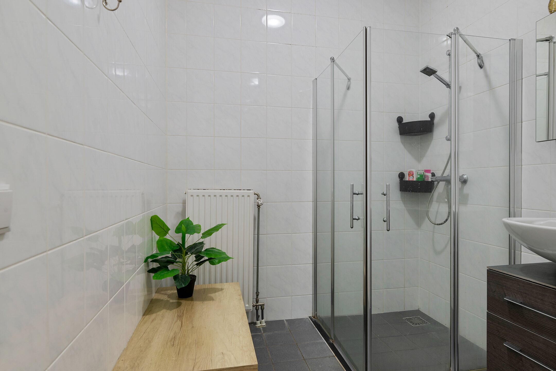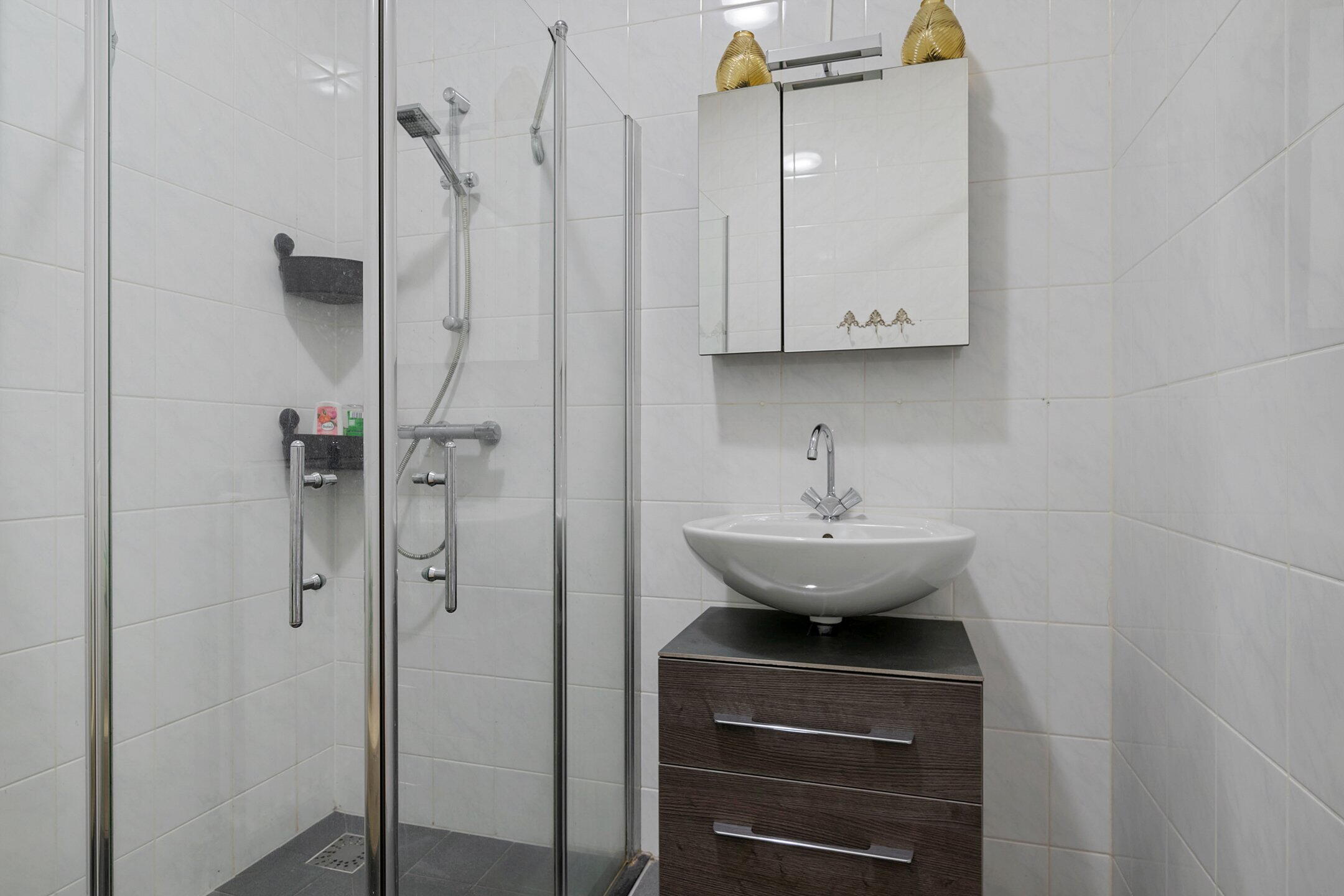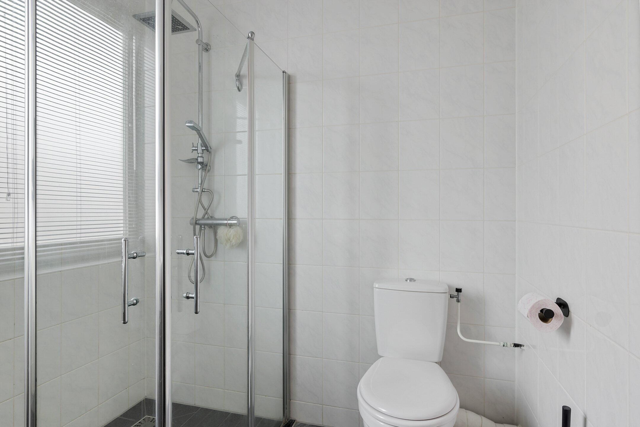 Eerste verdieping: Overloop; drie slaapkamers met de navolgende afmetingen: 10-, 12- en 12,5m²; badkamer in lichte kleurstelling en met volledige betegeling, voorzien van toilet, douche en wastafel.
