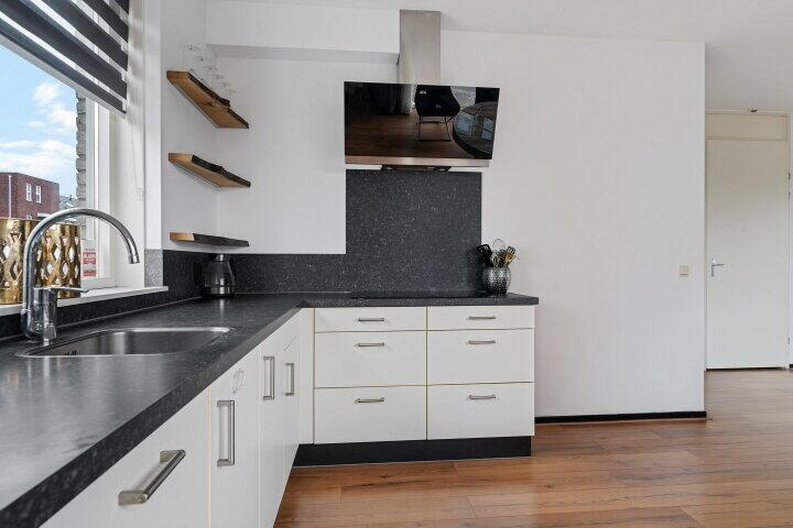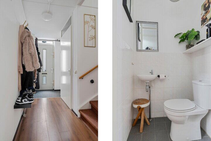Begane grond: Entree; hal met meterkast, toilet met fonteintje, trapopgang en doorgang naar woonkamer; tuingerichte woonkamer van 29m² met trapkast; open keuken in hoekopstelling welke is voorzien van diverse inbouwapparatuur (o.a. een koelkast, vriezer, vaatwasser, kookplaat, oven en afzuigkap).