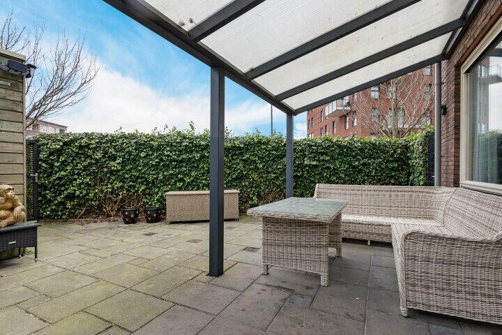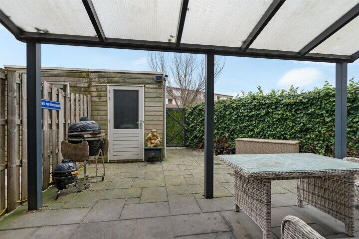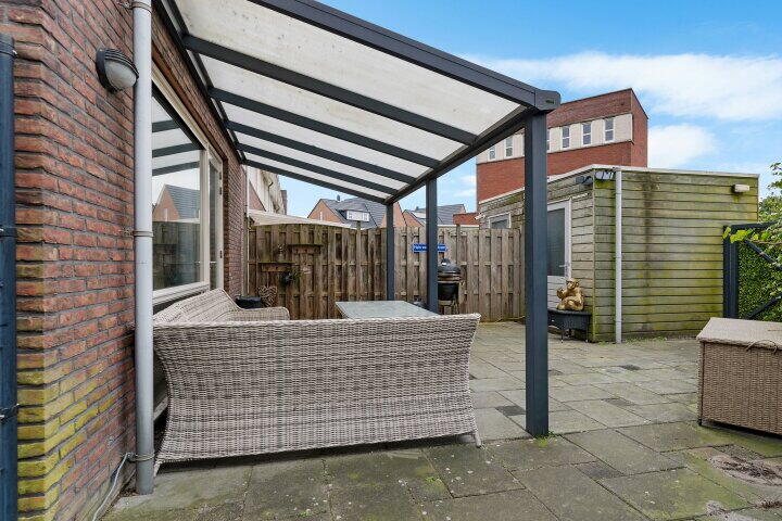 Tuin: Op het noorden gesitueerde achtertuin en zijtuin op het zuidoosten; de achtertuin is voorzien van een overkapping, bestrating en een vrijstaande houten berging.